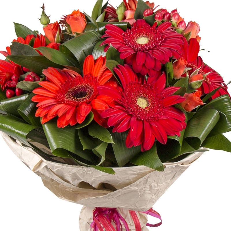 Букет состоит из 7 гербер, 4 ветки кустовых роз, 2 гиперикума, аспидистра, крафт, лента.