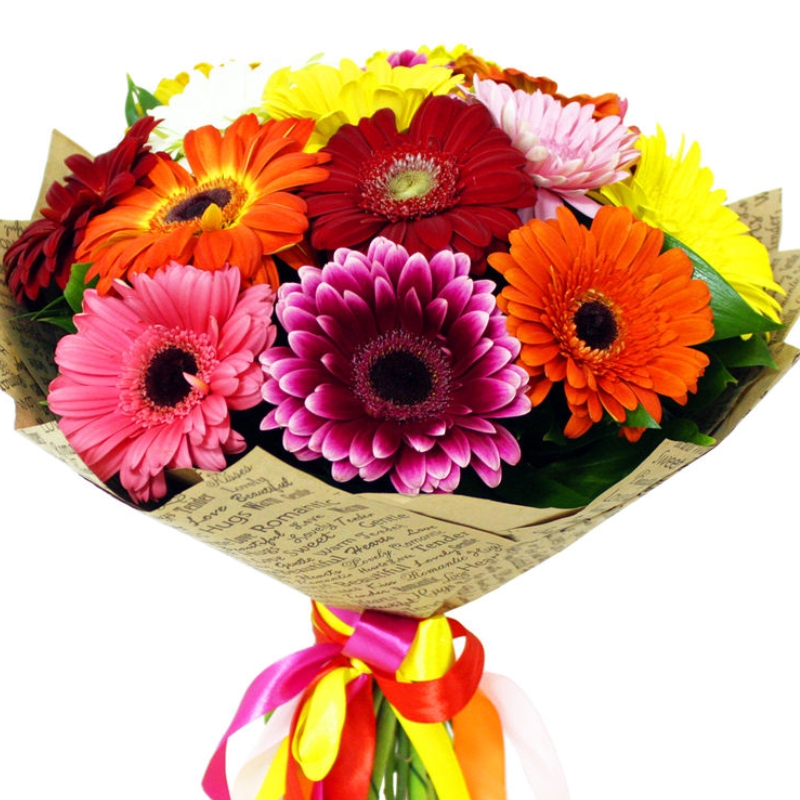 Букет состоит из MIX из 11 гербер, крафт, разноцветные ленты.
