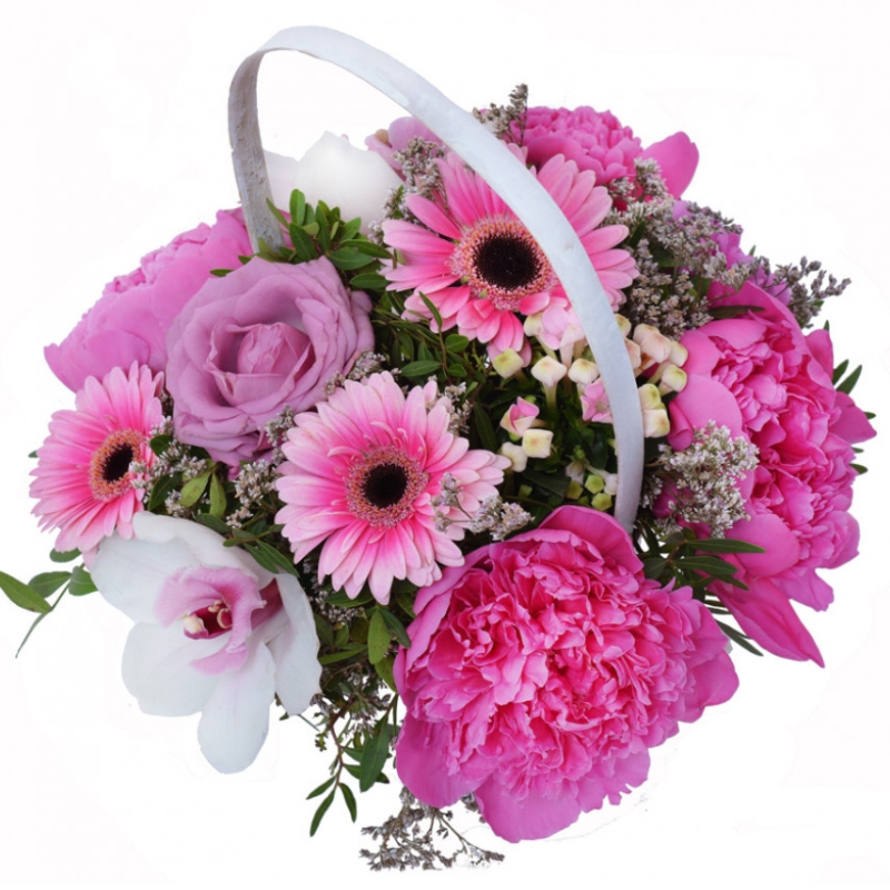 Букет состоит из 5 пионов, 2 розы, 2 гербера, 2 орхидеи, 1 бувардия, 3 лимониум, зелень, корзина, оазис.