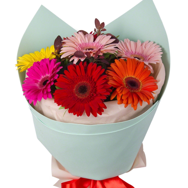 Букет состоит из MIX из 7 гербер, красивая упаковка, атласная лента.