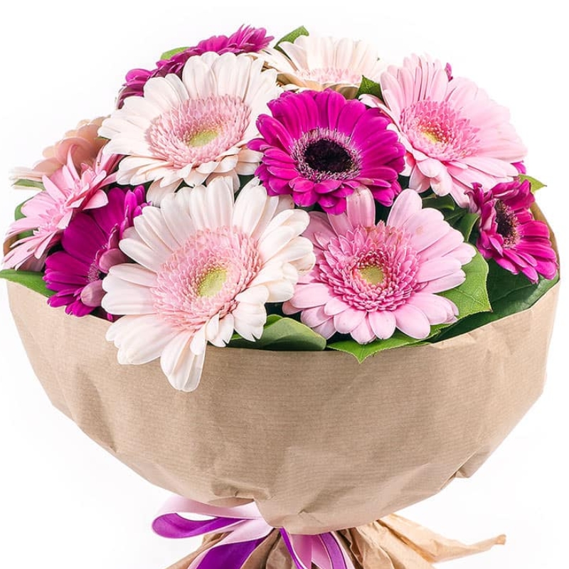 Букет состоит из MIX из 11 гербер, крафт, атласная лента.