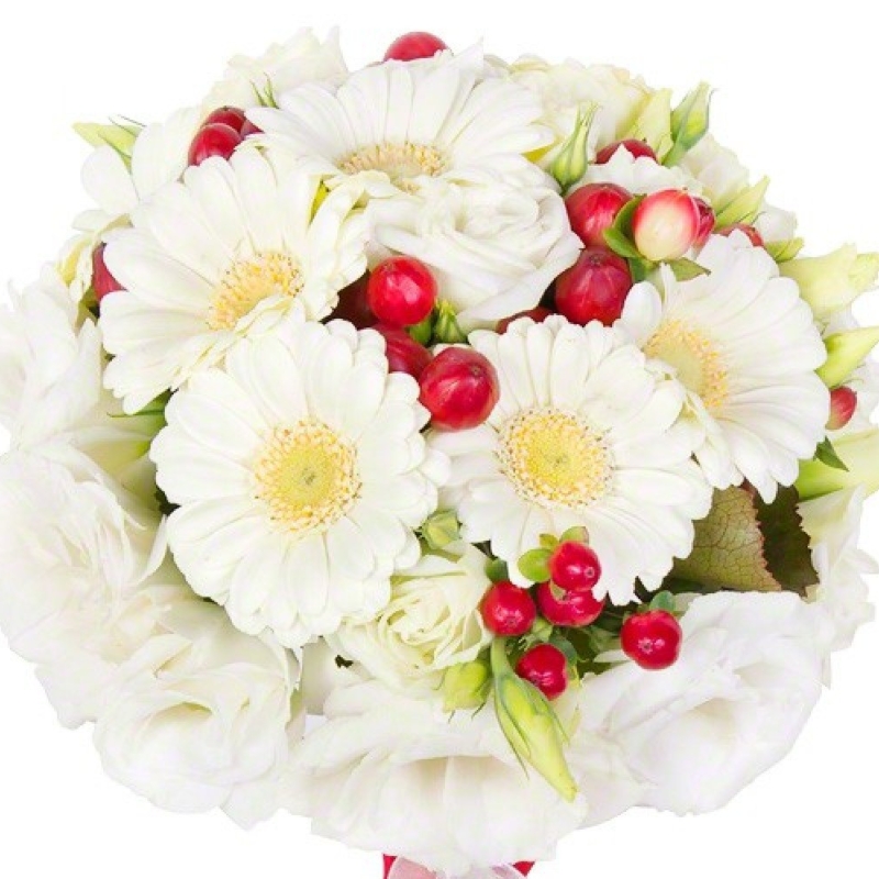 Букет состоит из 5 веток эустомы, 5 гербер, 2 ветки гиперикума, атласная лента.
