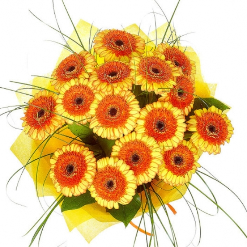 Букет состоит из 15 желтых гербер, салал, берграсс, красивая упаковка, атласная лента.