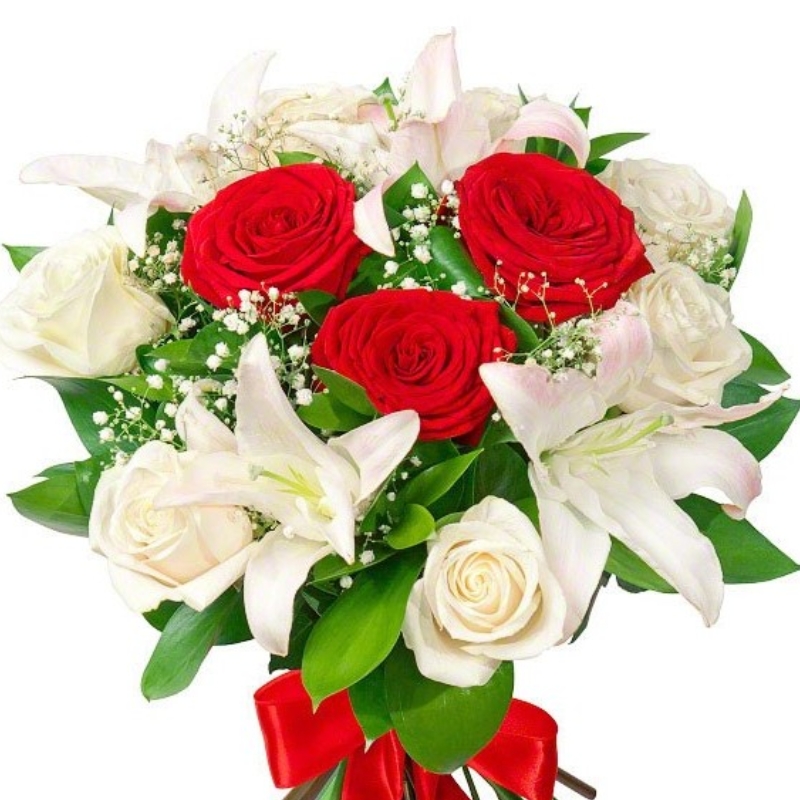 Букет состоит из 7 белых роз, 3 красные розы, 3 гипсофила, зелень, прозрачная упаковка, атласная лента.
