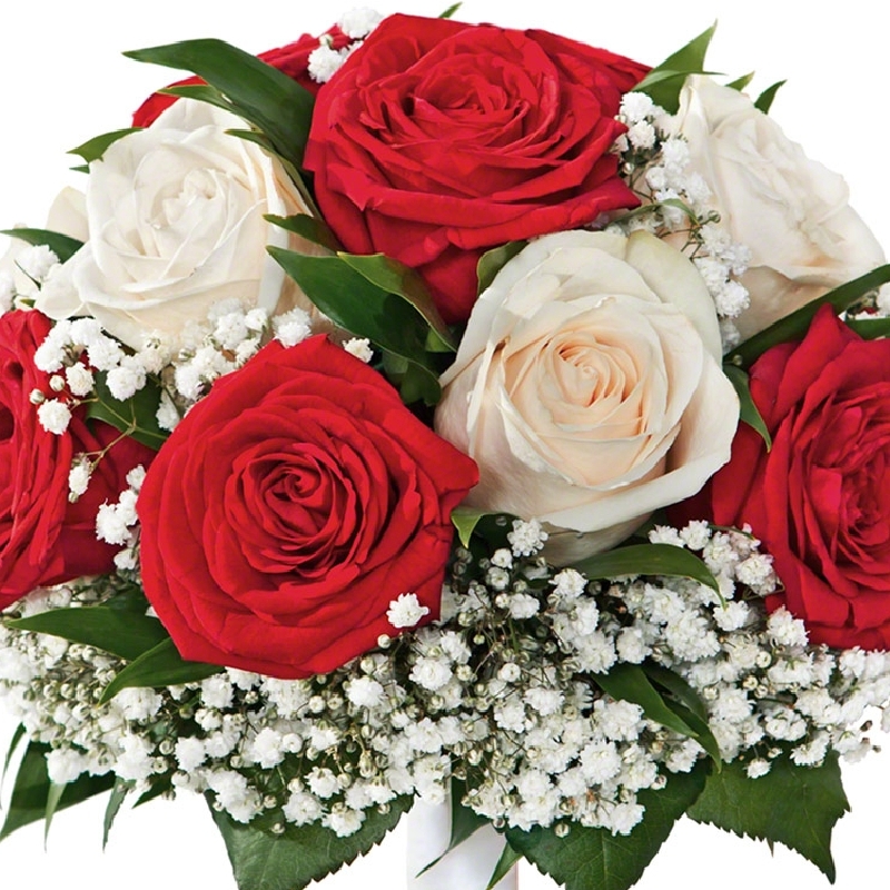 Букет состоит из 7 красных роз, 6 белых роз, 4 гипсофила, зелень, лента.