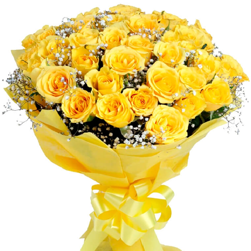 Букет состоит из 45 желтых роз, 4 ветки гипсофилы, красивая упаковка, атласная лента.
