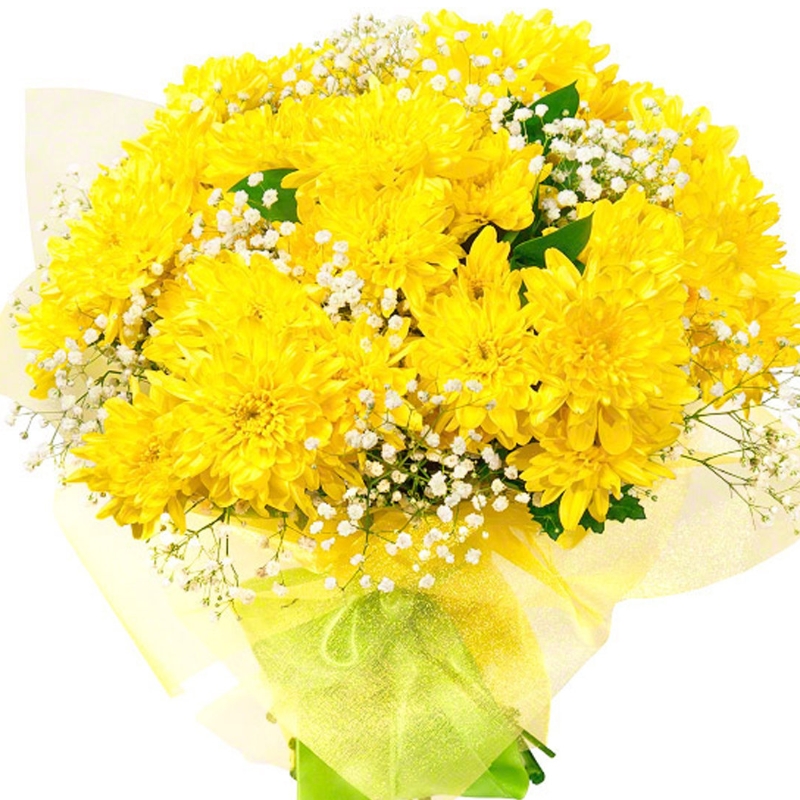 Букет состоит из 7 веток желтой хризантемы, 5 веток гипсофилы, зелень, сизаль, атласная лента.