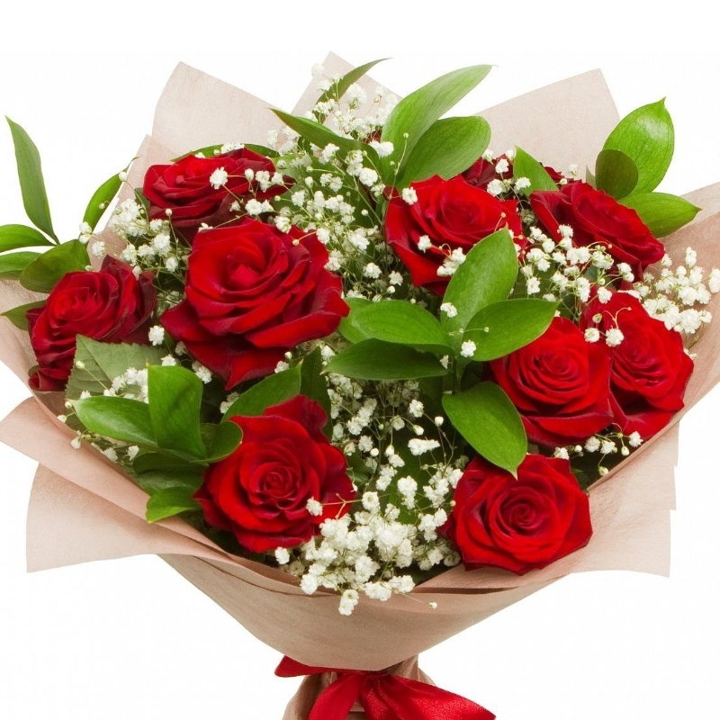 Букет состоит из 11 красных роз, 2 ветки гипсофилы, зелень, крафт, атласная лента.