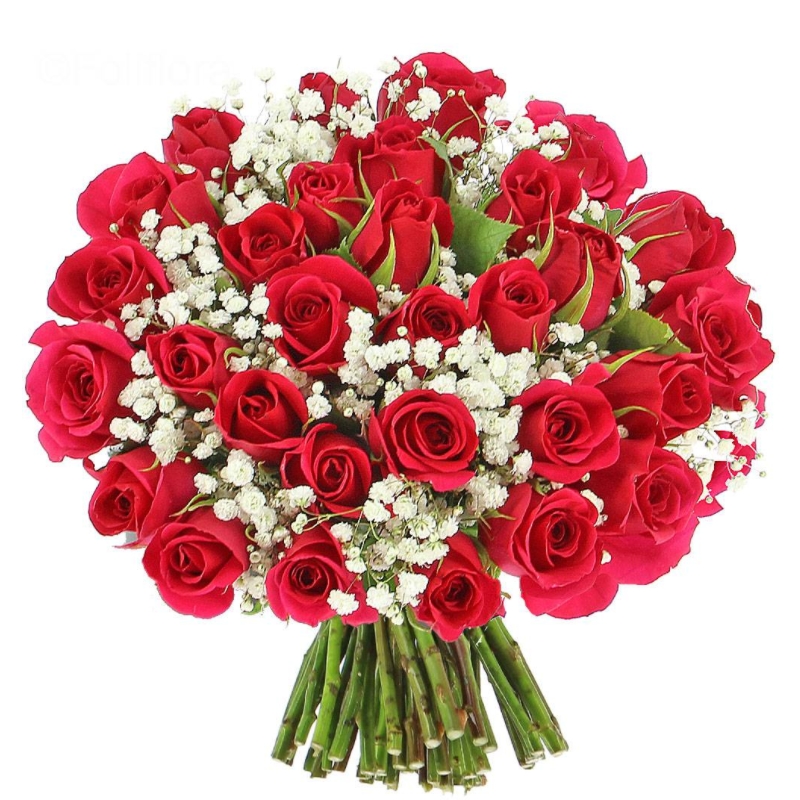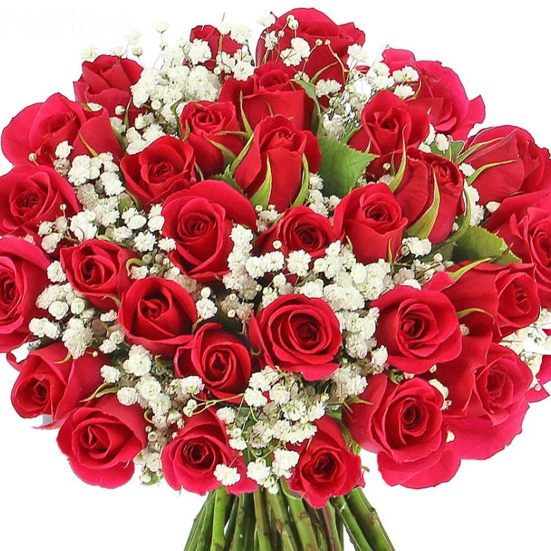 Букет состоит из 55 малиновых роз, 7 гипсофила, прозрачная упаковка, атласная лента.
