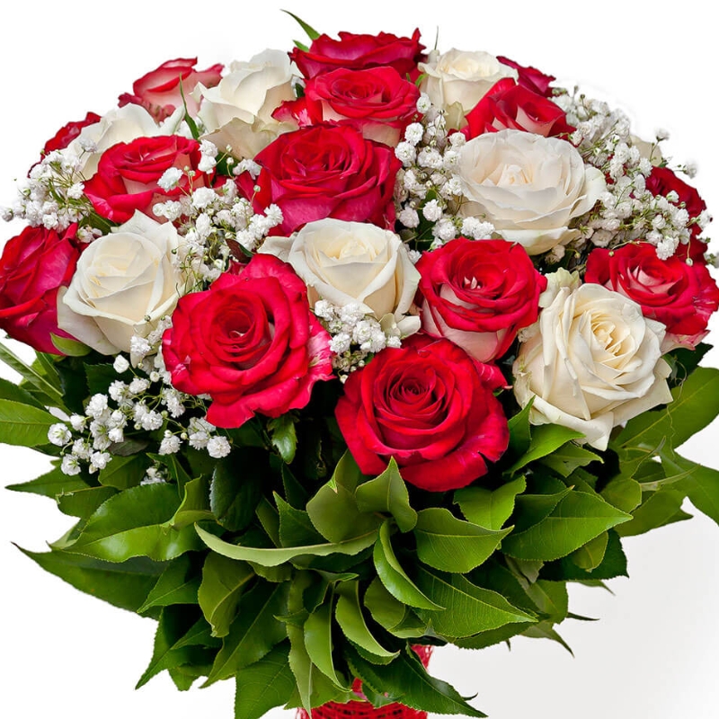 Букет состоит из 25 красных и белых роз, 2 ветки гипсофилы, зелень, прозрачная упаковка, атласная лента.