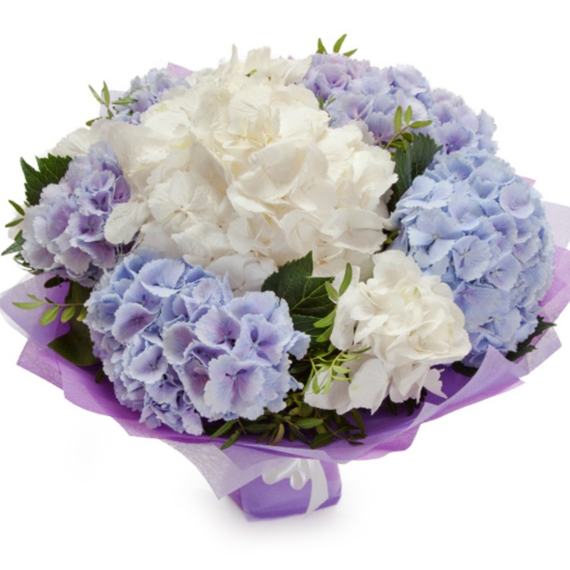 Букет состоит из 5 синих гортензий, 4 белые гортензии, зелень, красивая упаковка, атласная лента.