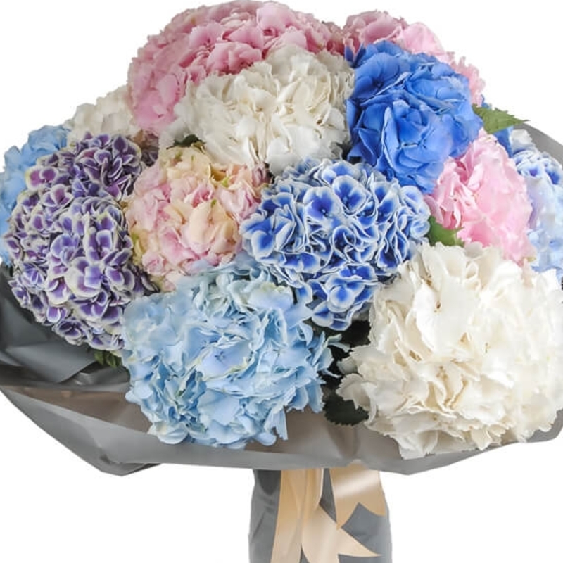 Букет состоит из 15 разноцветных гортензий, красивая упаковка, атласная лента.