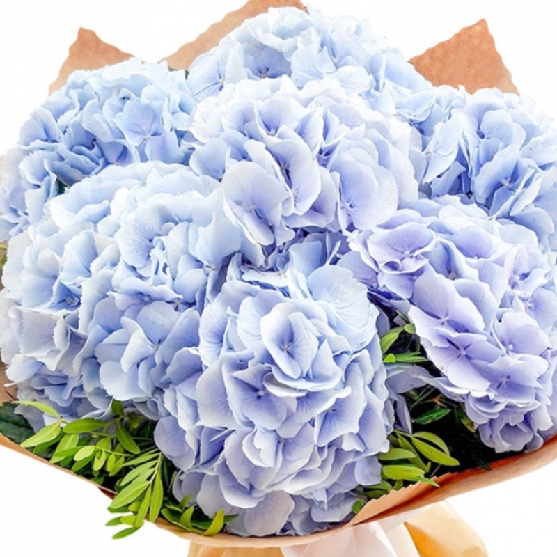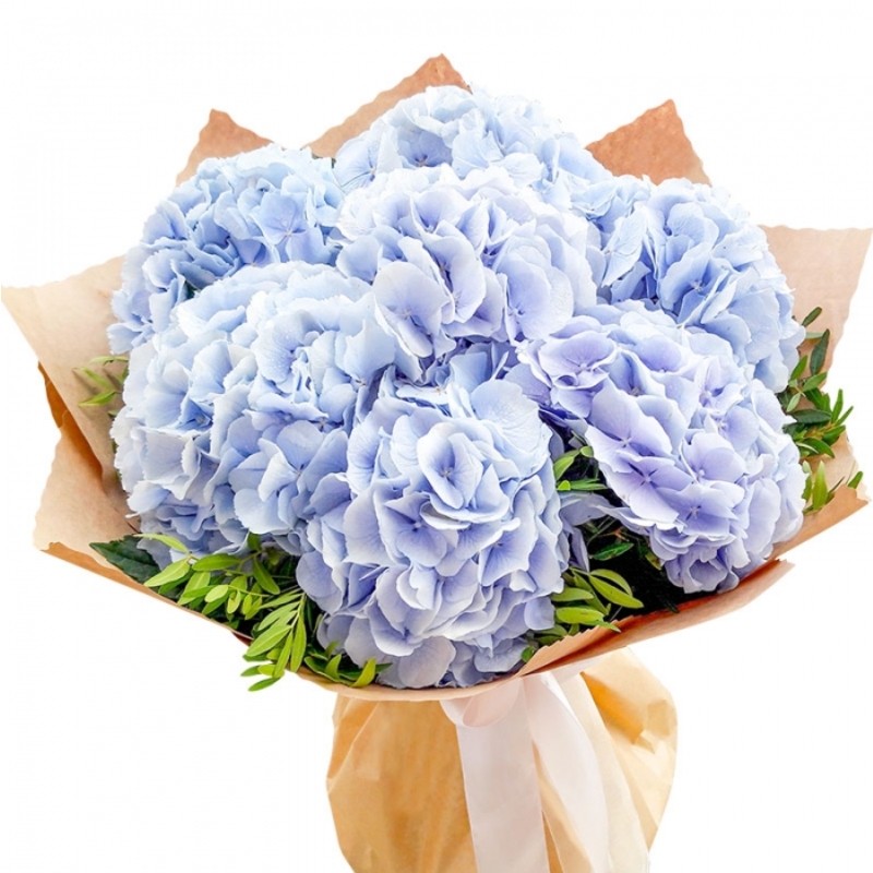Букет состоит из 7 голубых гортензий, зелень, крафт, атласная лента.
