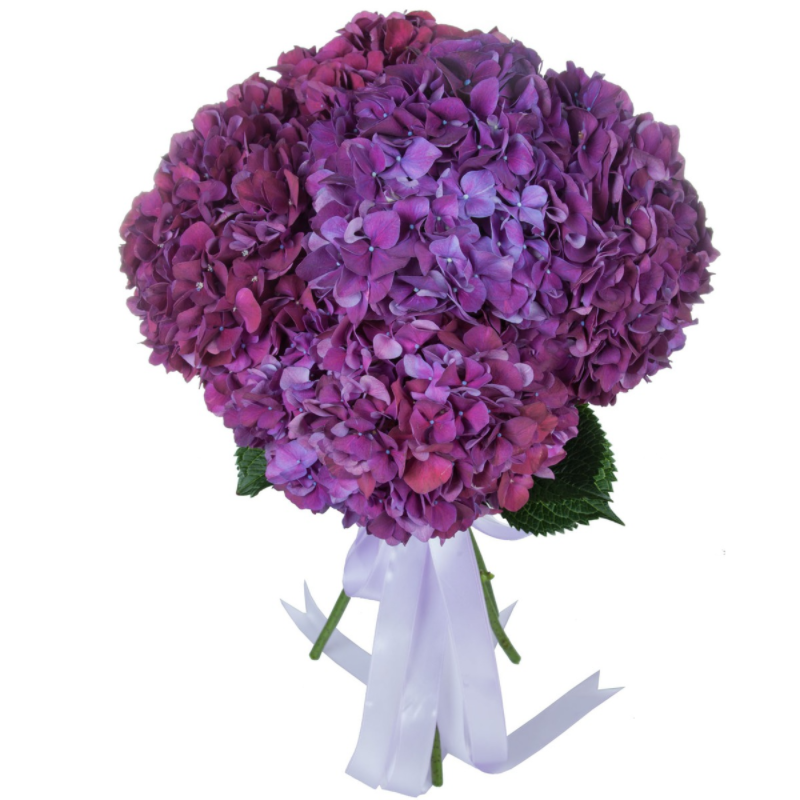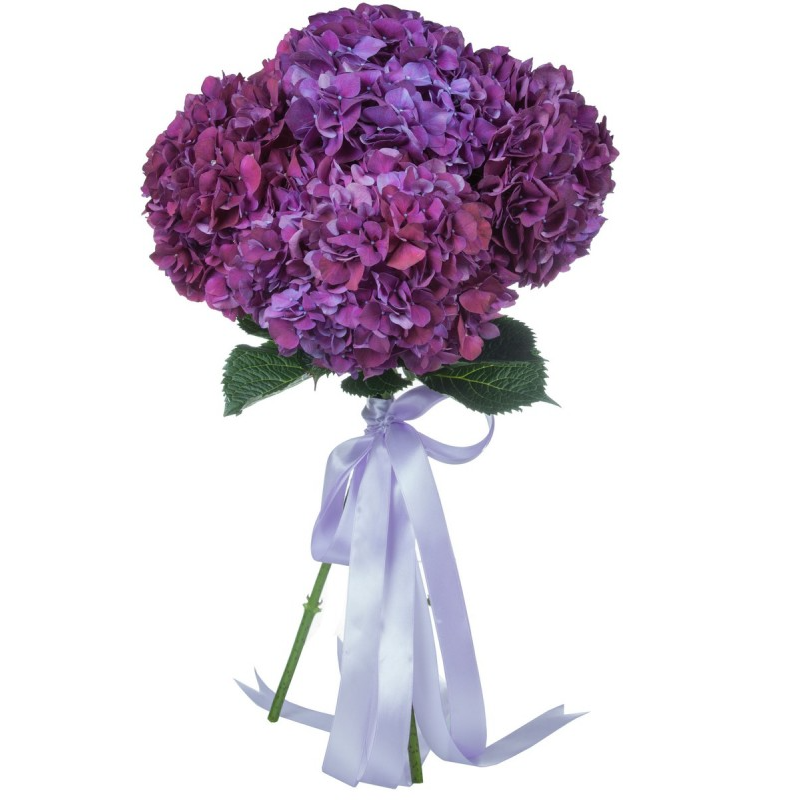 Букет состоит из 5 сиреневых гортензий, прозрачная упаковка, атласная лента.
