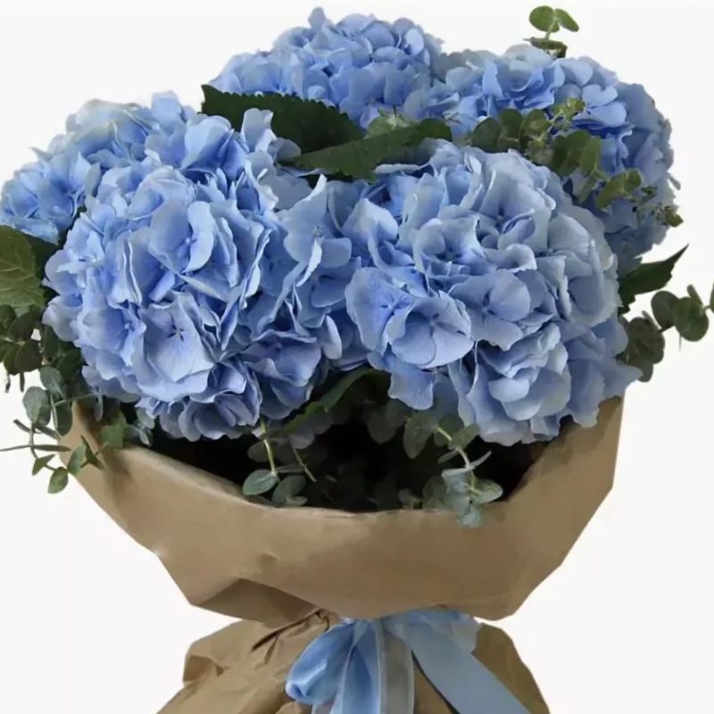 Букет состоит из 5 синих гортензий, зелень, крафт, атласная лента.
