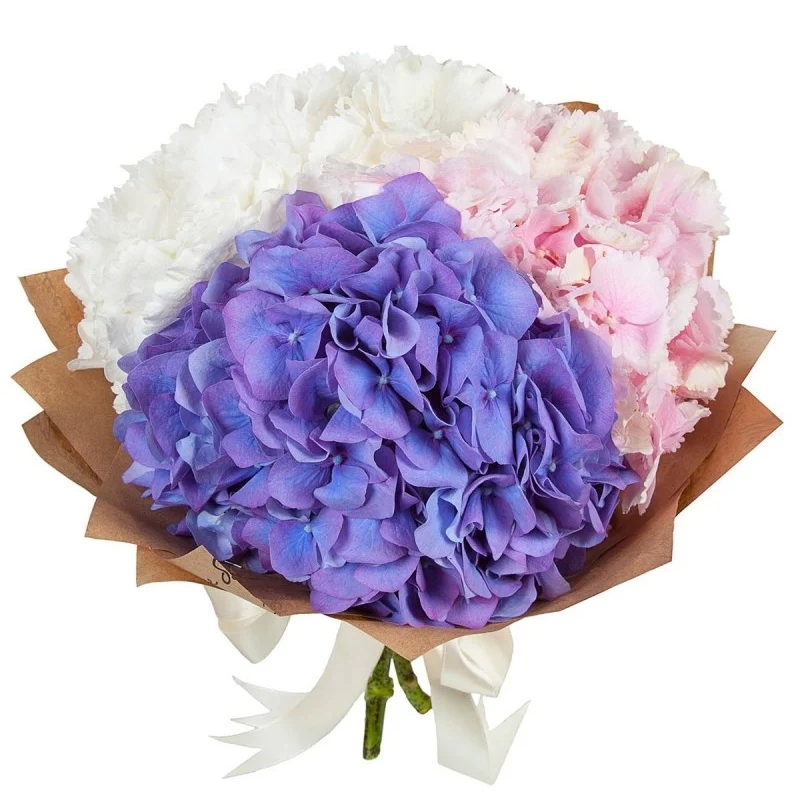Букет состоит из 3 гортензии, крафт, атласная лента.