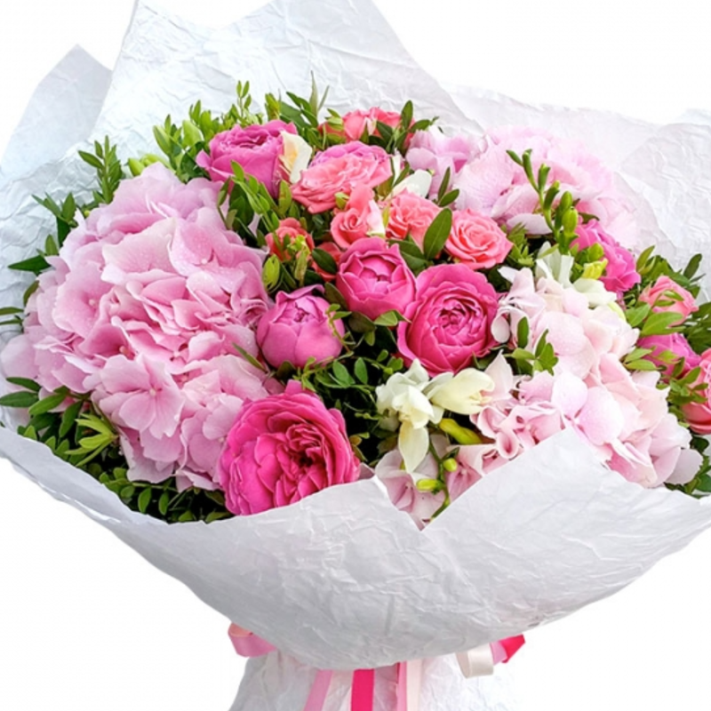 Букет состоит из 3 розовые гортензии, 5 веток пионовидных роз, зелень, упаковка, атласная лента.