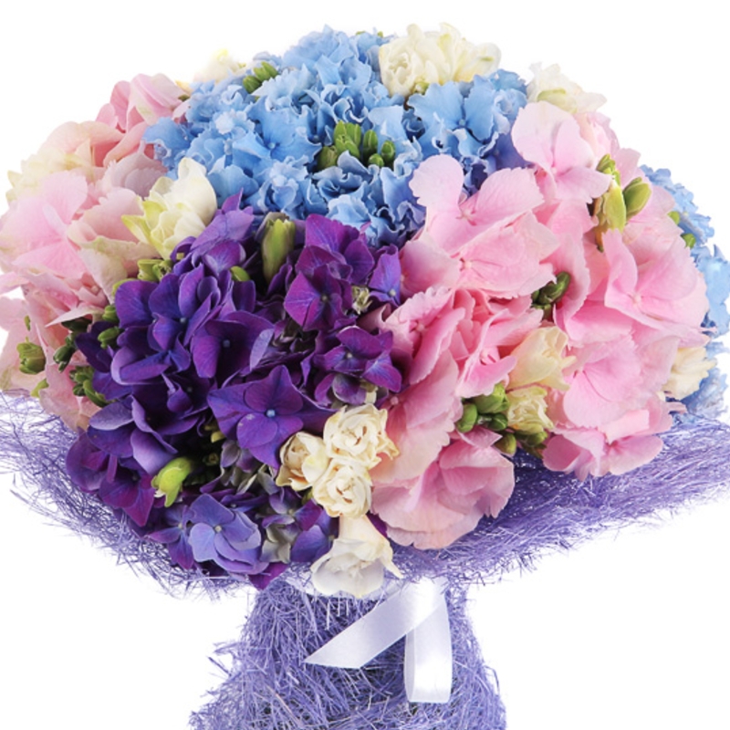 Букет состоит из 7 разноцветных гортензий, 6 веток эустомы, красивая упаковка, атласная лента.