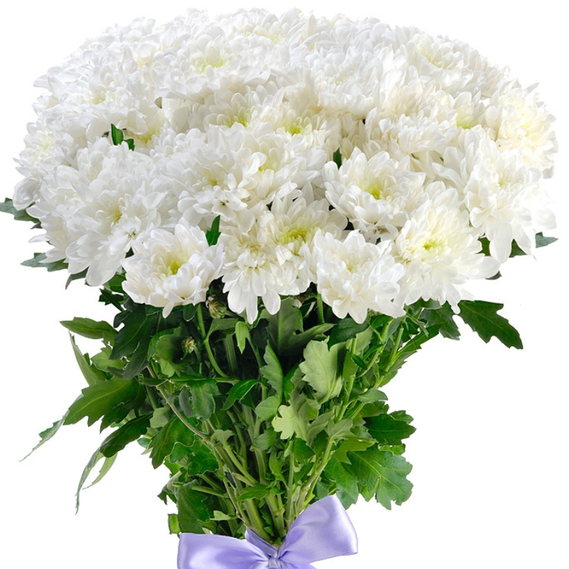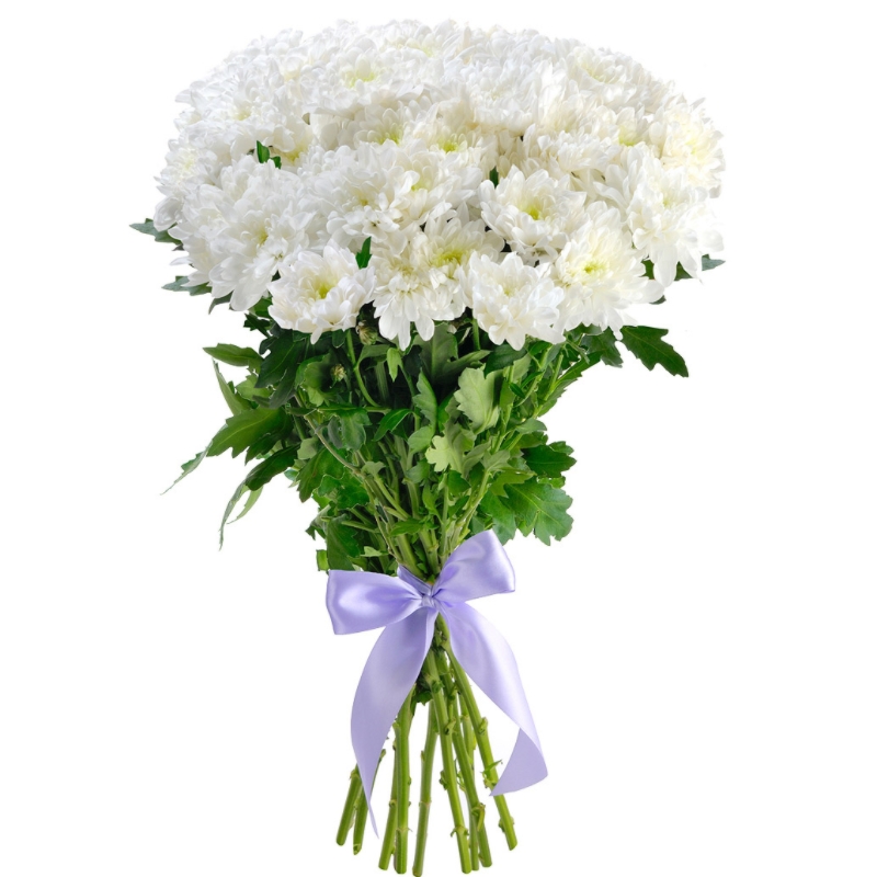 Букет состоит из 5 веток белой хризантемы, прозрачная упаковка, атласная лента.