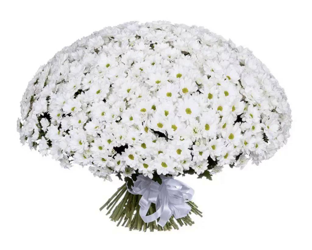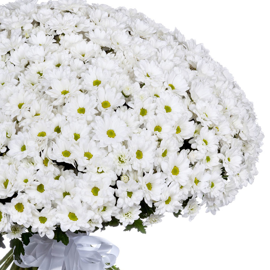 Букет состоит из 101 ветка белой ромашковой хризантемы, прозрачная упаковка, атласная лента.