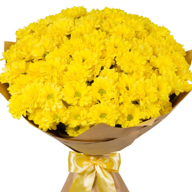 Букет состоит из 15 веток желтой хризантемы, крафт, желтая лента.