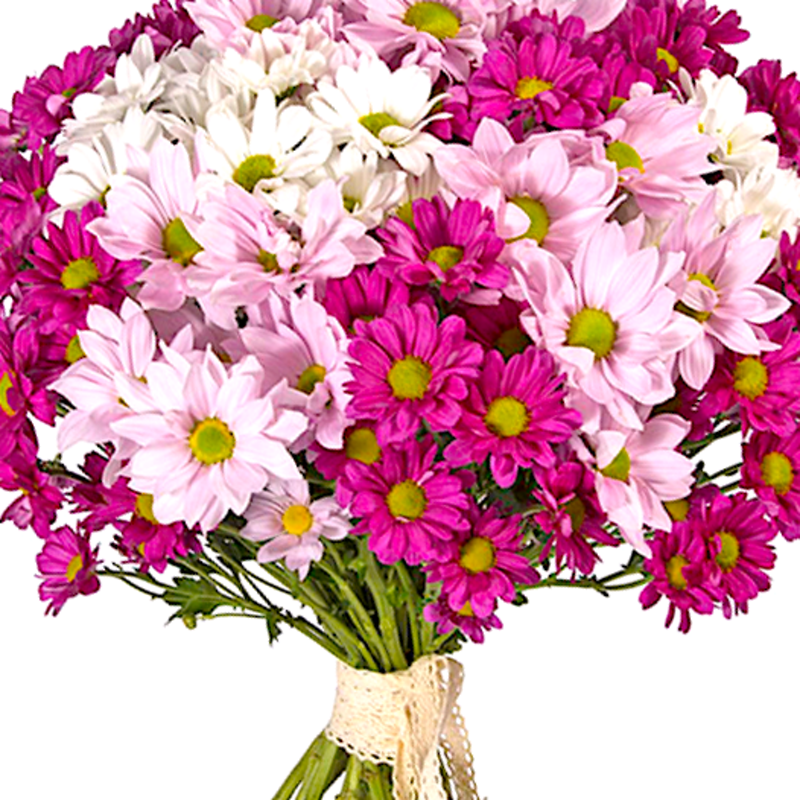 Букет состоит из MIX из 11 веток белой / розовой и красной хризантемы, прозрачная упаковка, атласная лента.