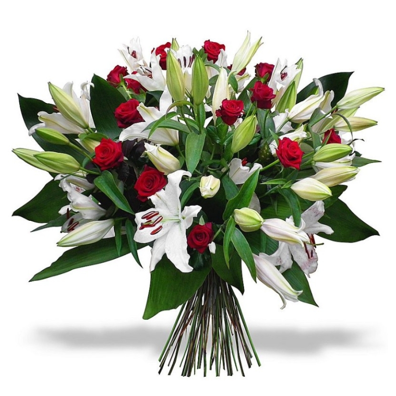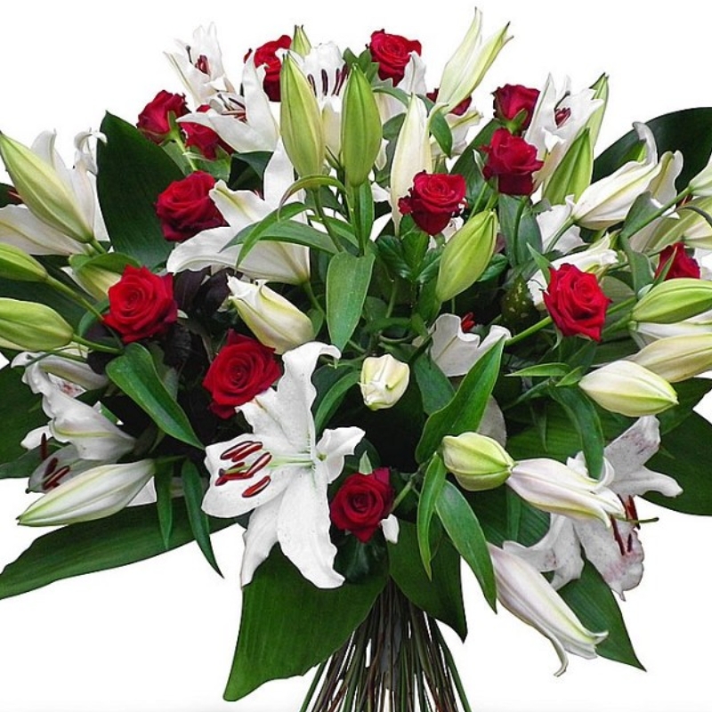 Букет состоит из 13 красных роз, 7 веток белых лилий, зелень, прозрачная упаковка, атласная лента.