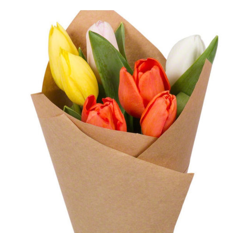 Букет состоит из 3 красных тюльпана, 2 желтых тюльпана, 2 белых тюльпана, крафт, атласная лента.