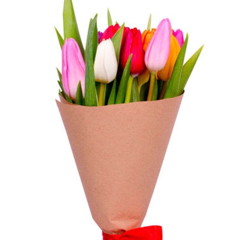 Букет состоит из 9 разноцветных тюльпанов, крафт, атласная лента.