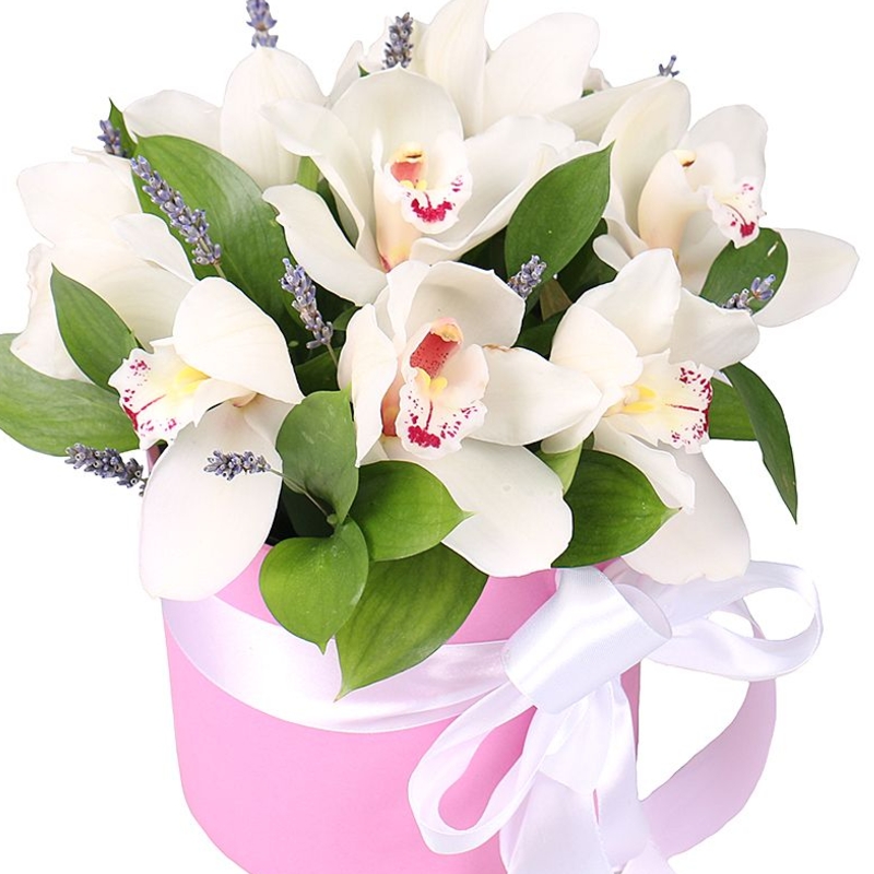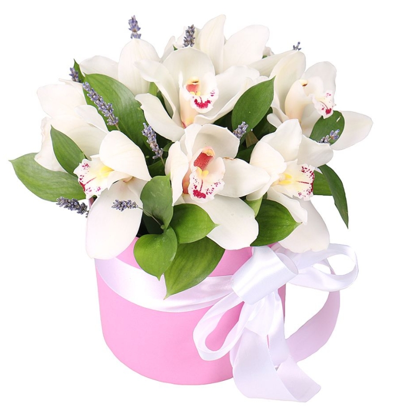 Букет состоит из 9 орхидей, лаванда, зелень, коробка, оазис, атласная лента.