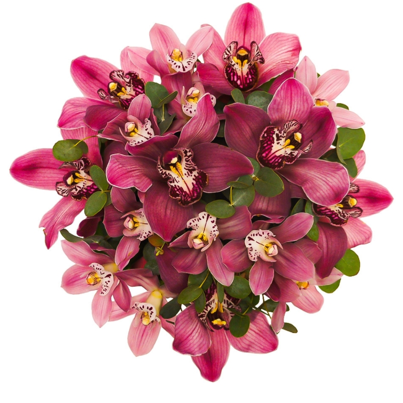 Букет состоит из 17 розовых орхидей, зелень, коробка, оазис.