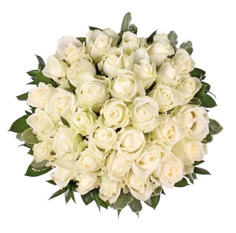Букет состоит из 35 белых роз, салал, коробка, атласная лента.