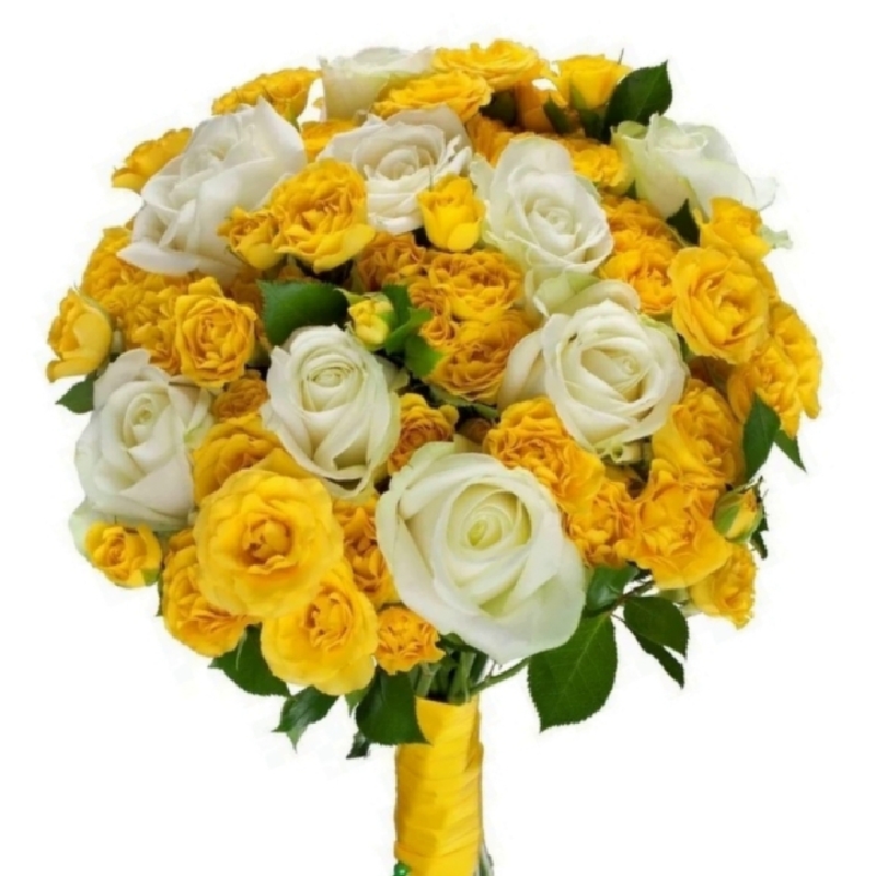 Букет состоит из 11 белых роз, 10 желтых кустовых роз, атласная лента.