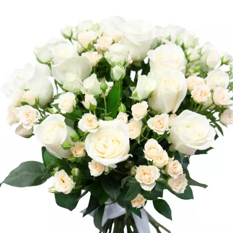 Букет состоит из 11 белых роз, 4 ветки кустовой розы, прозрачная упаковка, атласная лента.