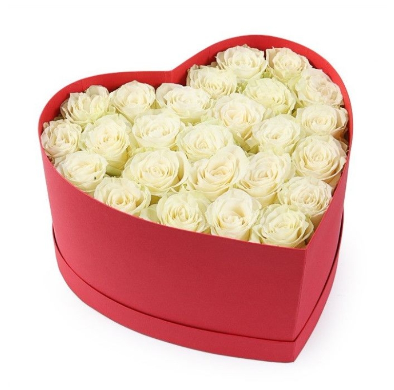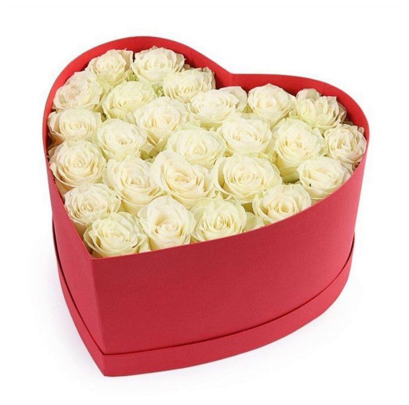 25 белых роз, коробка в виде сердца.