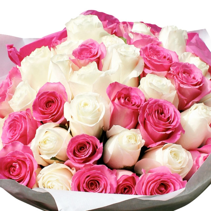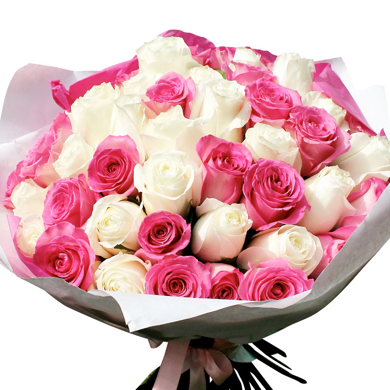 Букет состоит из 23 розовые розы, 22 белые розы, красивая упаковка, атласная лента.