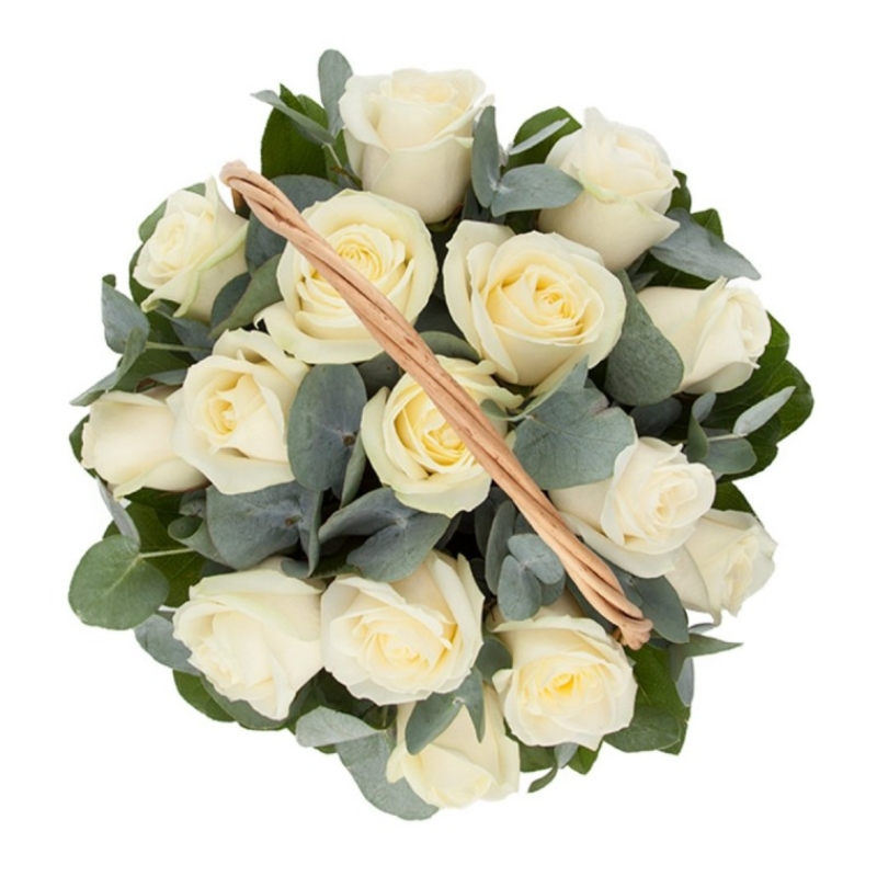 15 белых роз, салас, эвкалипт, корзина, оазис.