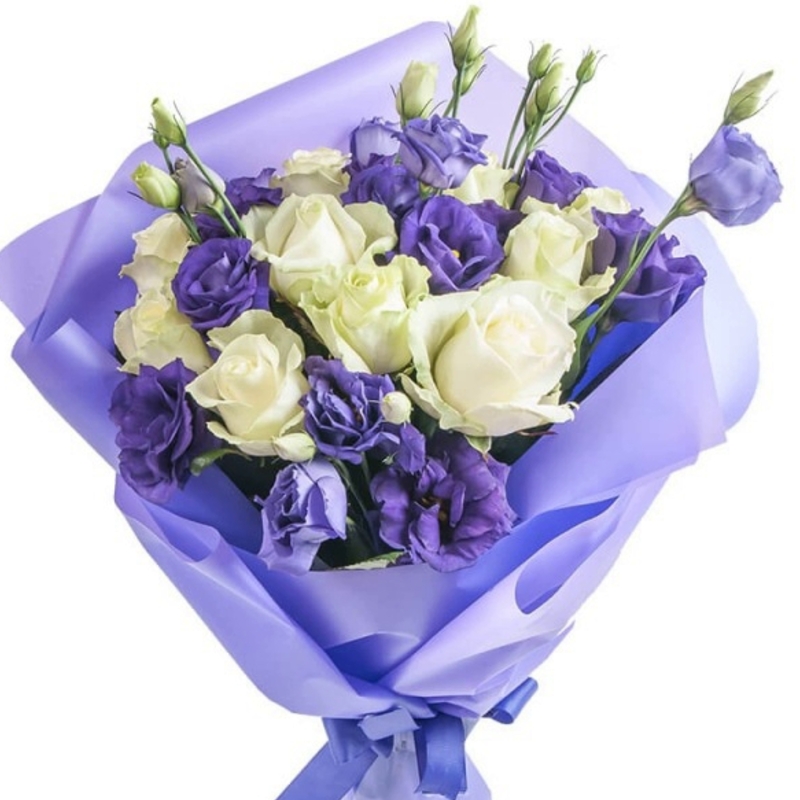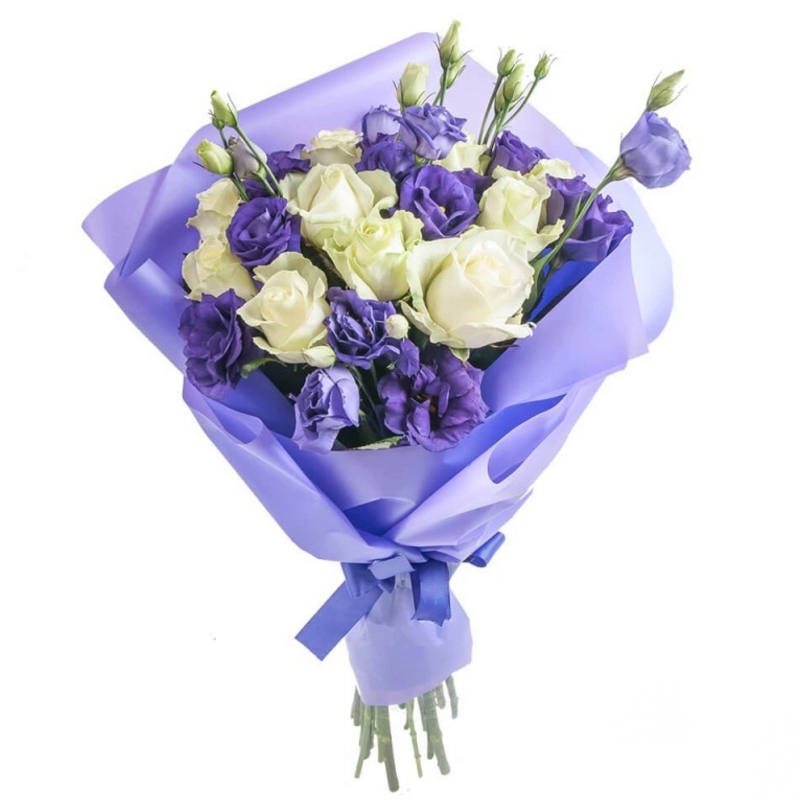 Букет состоит из 9 белых роз, 4 ветки эустомы, красивая упаковка, атласная лента.