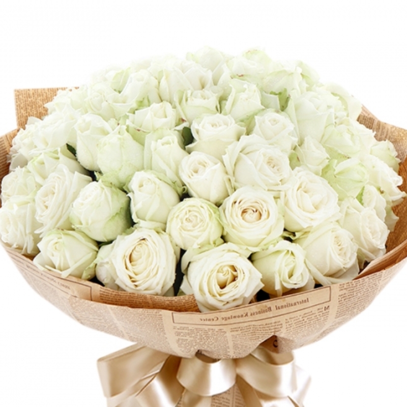 Букет состоит из 55 белых роз, крафт, атласная лента.
