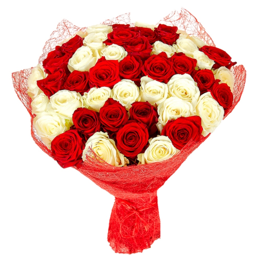 Букет состоит из 23 красные розы, 22 белые розы, красивая упаковка, атласная лента.