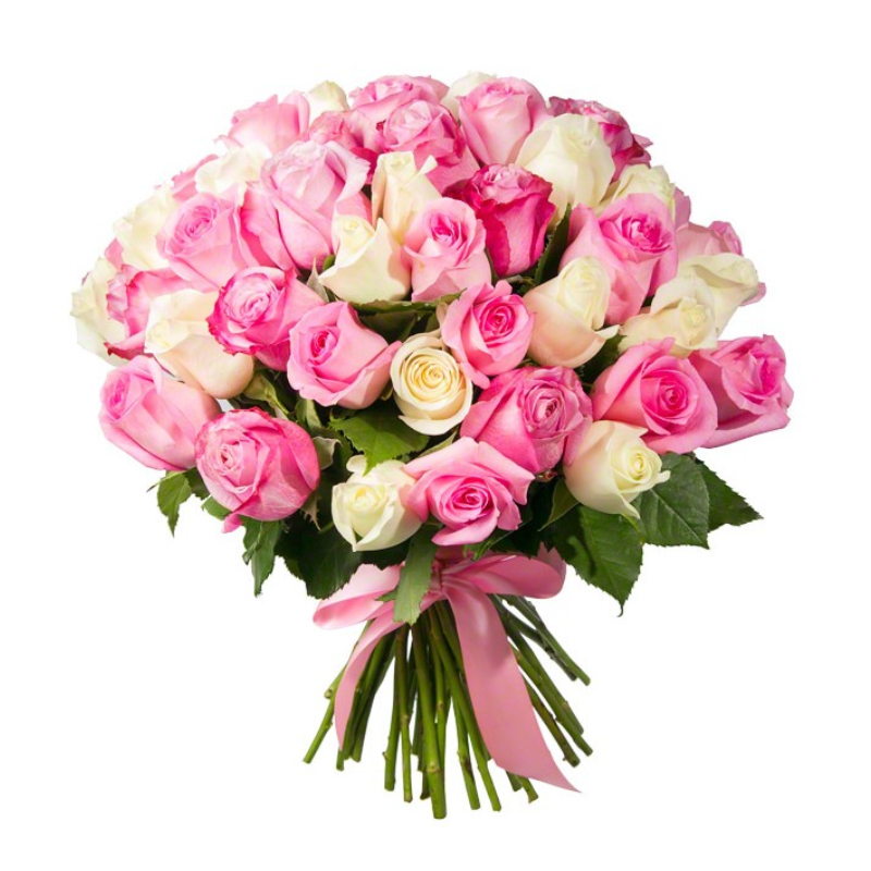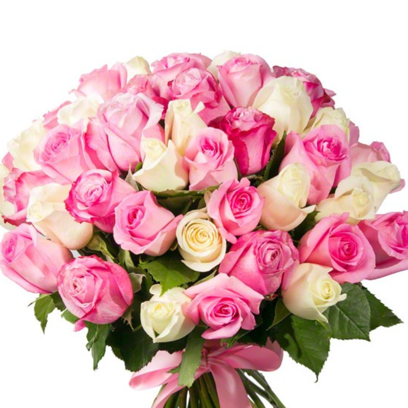 Букет состоит из Букет из 25 белых роз Кения, 26 розовых роз Кения, прозрачная упаковка, атласная лента.