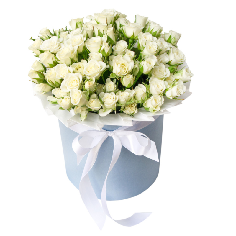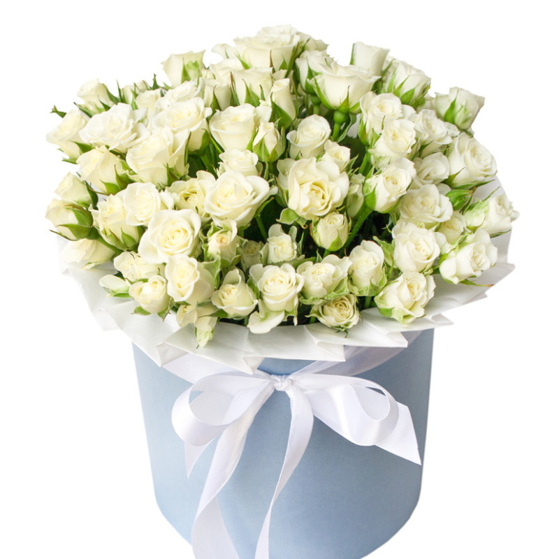 Букет состоит из 19 кустовых роз, коробка, оазис, атласная лента.