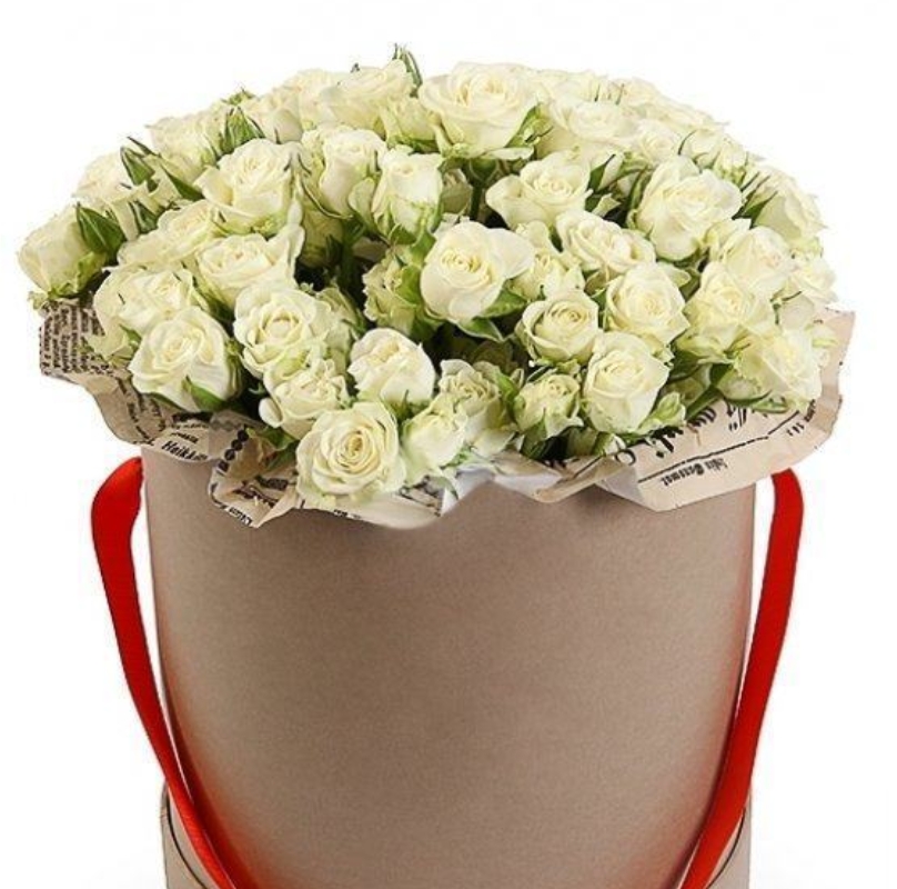 Букет состоит из 21 ветка белой кустовой розы, крафт, оазис, коробка.