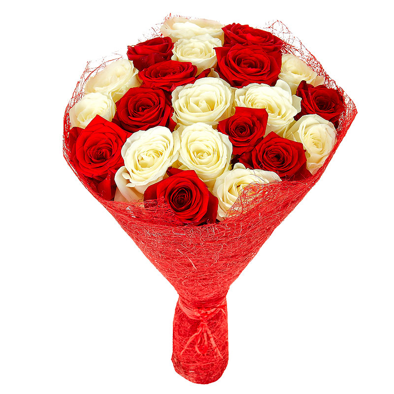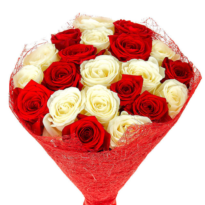 Букет состоит из 13 белых роз, 12 красных роз, красивая упаковка, атласная лента.