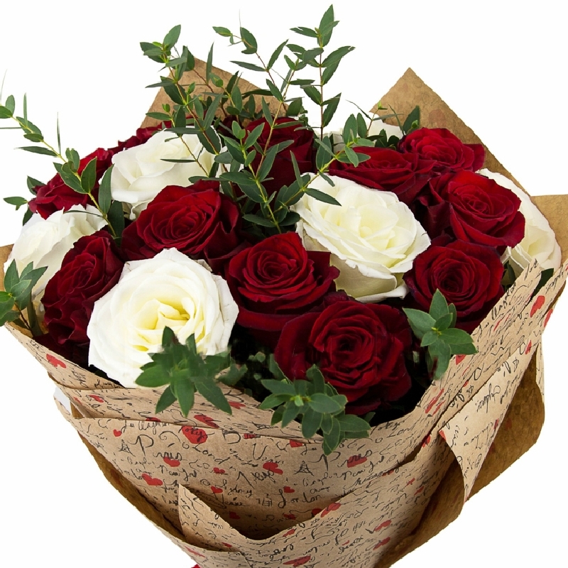 Букет состоит из 11 бордовых роз, 6 белых роз, зелень, крафт, атласная лента.