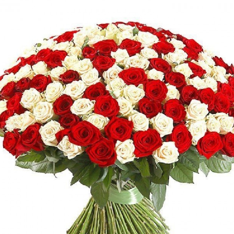 Букет состоит из MIX из 201 красной и белой розы, прозрачная упаковка, атласная лента.