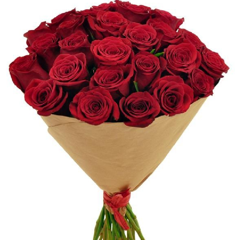 Букет состоит из 27 бордовых роз, крафт, атласная лента.