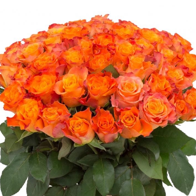 Букет состоит из 55 оранжевых роз, прозрачная упаковка, атласная лента.