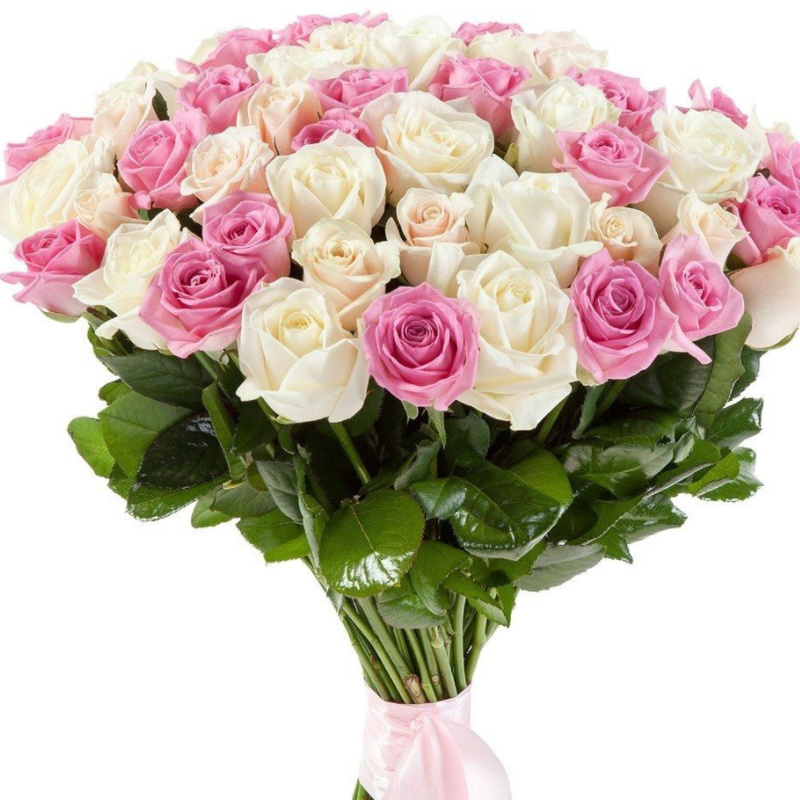 Букет состоит из 26 белых роз, 25 розовых роз, прозрачная упаковка, атласная лента.