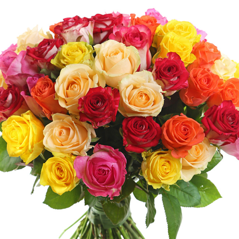 Букет состоит из MIX из 41 красной / оранжевой / розовой и желтой розы Кения, прозрачная упаковка, атласная лента.